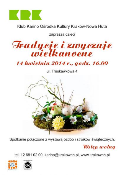 Wielkanoc dzieciom kojarzy się przede wszystkim z palmą, pisankami, święceniem pokarmów i lanym poniedziałkiem. Na spotkaniu w Klubie Karino Ośrodka Kultury Kraków-Nowa Huta (ul. Truskawkowa 4). dowiedzą się o innych ciekawych tradycjach i zwyczajach związanych ze Świętami, z których wiele praktykowanych jest do dziś. Zajęcia połączone będą z wystawą ozdób i stroików świątecznych.