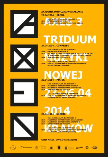 - koncerty otwarte dla szerokiej publiczności, na których będą wykonane kompozycje napisane specjalnie na tę okazję (Sala Koncertowa Akademii Muzycznej w Krakowie):