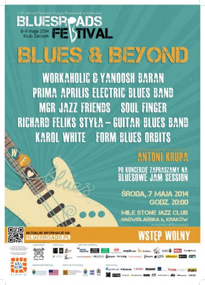 Blues & Beyond. Koncert który zgromadzi plejadę krakowskich muzyków reprezentujących różne obszary muzycznych poszukiwań, ale w których muzycznych biografiach blues zawsze się przewijał i do którego zawsze chętnie wracają. Pośród wykonywanych utworów znajdą się zarówno standardy bluesowe polskich i światowych wykonawców, jazzowe interpretacje standardów bluesowych a także autorskie kompozycje które wyrosły na bluesowej harmonii i dwunastotaktowej formie. I właśnie te dwanaście taktów będzie klamrą spinającą program koncertu Blues & Beyond… A co w trakcie koncertu usłyszycie poza bluesem? Tego dzisiaj nikt nie jest w stanie przewidzieć. Koncert zwieńczony będzie występem znakomitego gitarzysty Ryszarda Feliksa Styły wraz z zespołem w którym wystąpią Piotr Kosieradzki, Waldemar Gołębski, Radosław Kopeć, Bogusław Mietniowski i Sławomir Berny. A więc zabierz szwagra, zabierz kuzynkę i przyjdź 7ego maja do klubu Milestone na koncert Blues & Beyond, na prolog festiwalu Bluesroads.