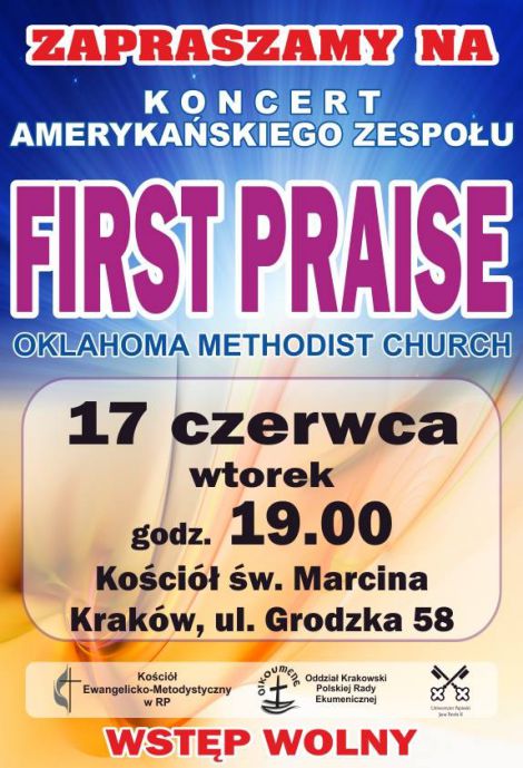 Serdecznie zapraszamy na koncert amerykańskiego zespołu "First Praise" z Oklahoma Methodist Church (Metodystycznego Kościoła Oklahomy)!