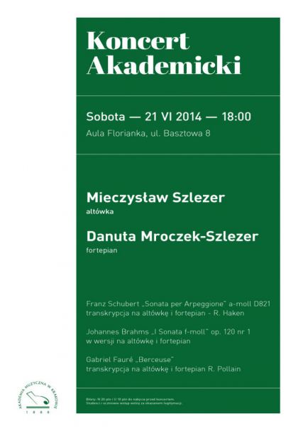 W sobotę 21 czerwca o godzinie 18:00 w Auli Florianka zagra duet cenionych pedagogów Akademii Muzycznej w Krakowie: Mieczysław Szlezer - altówka oraz Danuta Mroczek-Szlezer - fortepian. W programie koncertu znajdą się: