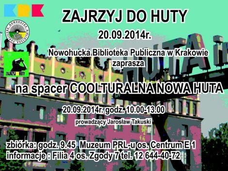 W godzinach od 9.45 do 13.00 po najciekawszych zakątkach dzielnicy związanych z kulturą będzie oprowadzał Jarosław Takuski, animator kultury, urodzony nowohucianin, działający w Stowarzyszeniu Szersze Horyzonty. Przy wybranych obiektach czytane będą fragmenty prozy związanej z danym miejscem. Zapisy trwają do 20 września pod nr. tel. 12 644 40 72 lub w Filii nr 4, os. Zgody 7.