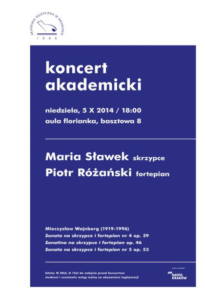 W niedzielę 5 października o godzinie 18:00 w Auli „Florianka” zabrzmią dzieła na skrzypce i fortepian Mieczysława Wajnberga. Wykonawcami koncertu będą doktoranci Akademii Muzycznej w Krakowie: skrzypaczka Maria Sławek i pianista Piotr Różański.