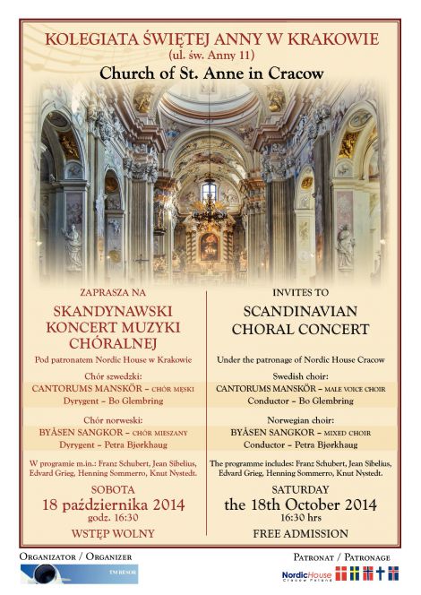 W sobotę , 18 października o godz.16:30, w Kolegiacie Św.Anny w Krakowie (ul. Św.Anny 11) odbędzie się koncert chórów ze Szwecji i Norwegii: chór męski Cantorums oraz chór mieszany Byåsen.