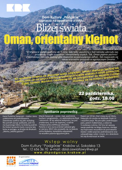 Na spotkaniu z nami dowiesz się dlaczego warto odwiedzić Oman i dlaczego ten kraj tak bardzo różni się od innych bardzo popularnych krajów arabskich Afryki północnej (Egipt, Tunezja, Maroko). Opowiemy jak się przygotować do wyjazdu i czego możemy się na miejscu spodziewać.