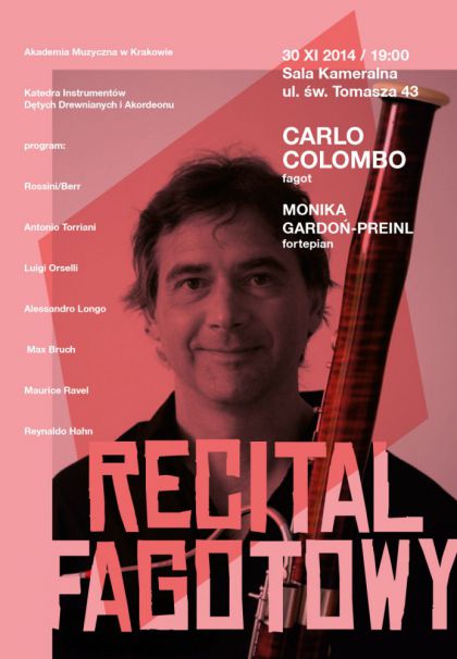 Katedra Instrumentów Dętych Drewnianych i Akordeonu Akademii Muzycznej w Krakowie serdecznie zaprasza w niedzielę 30 listopada o godzinie 19:00 do sali kameralnej Akademii Muzycznej w Krakowie na mistrzowski recital fagotowy. Wystąpi światowej sławy fagocista Carlo Colombo. Na fortepianie towarzyszyć mu będzie Monika Gardoń-Preinl. Wstęp na koncert wolny.