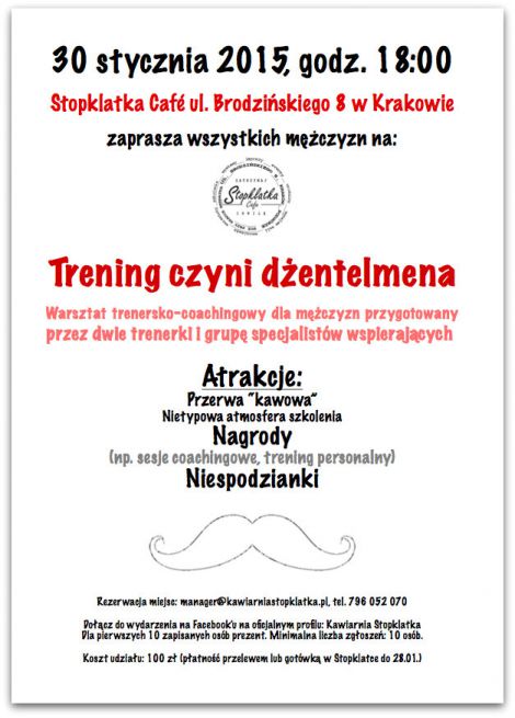 Po takim warsztacie odkryjesz, jak zwiększyć swoją atrakcyjność w oczach kobiet i być dżentelmenem we współczesnym świecie. Dowiesz się czego nie wiesz, że nie wiesz, poznasz lepiej siebie i swoje możliwości. Będzie też coś o wyglądzie, coś o zachowaniu, coś o głosie… Warsztat z elementami ćwiczeń coachingowych, z klasą w atmosferze zaufania i dobrego humoru, przy filiżance “małej czarnej”. W drogę!