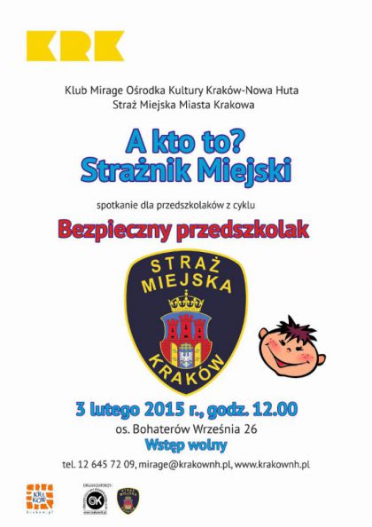 Klub Mirage Ośrodka Kultury Kraków-Nowa Huta zaprasza na spotkanie dla przedszkolaków prowadzone przez Straż Miejską w ramach cyklu Bezpieczny przedszkolak. Dzieci dowiedzą się, na czym polega praca Strażnika Miejskiego, w jakich sytuacjach trzeba skontaktować się ze Strażą Miejską i pod jakim numerem telefonu. Strażnicy zaprezentują umundurowanie i sprzęt służbowy a dzięki interaktywnej planszy oraz zabawom logicznym będą mogły w praktyczny sposób utrwalić zdobytą wcześniej wiedzę.