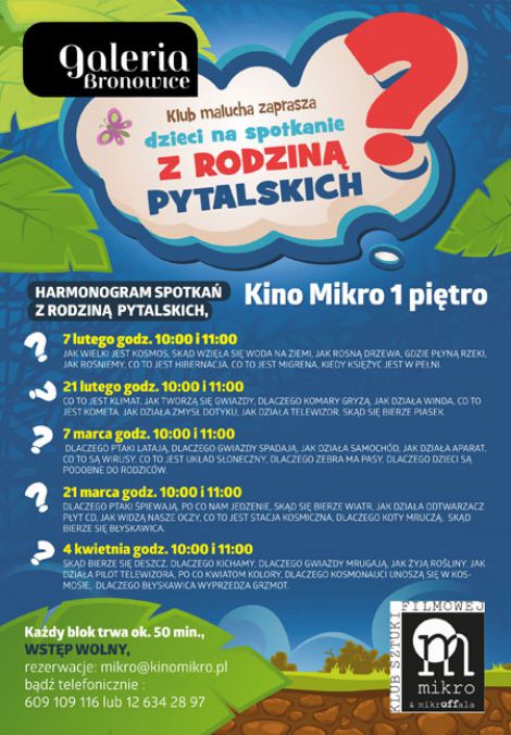 Jak działa winda i telewizor? Skąd się bierze piasek i co to jest klimat? Dlaczego komary nas gryzą i jak tworzą się gwiazdy? Na te i wiele innych pytań mali i nieco starsi kinomani znajdą odpowiedź w trakcie kolejnego już spotkania z „Rodziną Pytalskich”. Wraz z sympatycznym i niezwykle dociekliwym Wiktorkiem - bohaterem bajek edukacyjnych – maluchy w przystępny sposób dowiedzą się jak jest zbudowany świat. „Rodzina Pytalskich” to propozycja dla dzieci w wieku przedszkolnym i wczesnoszkolnym.