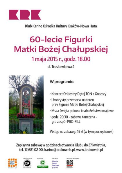 Klub Karino Ośrodka Kultury Kraków-Nowa Huta (ul. Truskawkowa 4) zaprasza na spotkanie mające na celu uczczenie 60-lecia powstania kapliczki w osiedlu Chałupki. Kaplicę z figurą Matki Bożej ufundowali mieszkańcy osiedla Chałupki i nadal o nią dbają i ją odnawiają. Obecnie przy kapliczce powstał wydzielony pas zieleni, który pielęgnują panie działające społecznie w Klubie Karino. Uroczystości obchodów 60-lecia powstania figurki odbędą się 1 maja br. i rozpoczną się o godz. 18.00 przy Klubie Karino. Orkiestra Dęta TON z Goszczy wykona koncert pieśni patriotycznych, następnie korowód uczestników uda się w kierunku figurki Matki Bożej Chałupskiej, przy której odbędzie się msza polowa i nabożeństwo majowe. Uroczystości zakończy zabawa taneczna w Klubie. Zapisy na zabawę taneczną (tel. 12 681 02 00, karino@krakownh.pl).