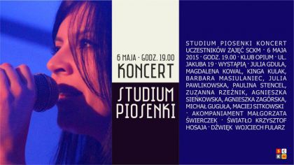 Zapraszamy na koncert uczestników zajęć SCKM 6 maja o godzinie 19:00 w Klubie Opium ul. Jakuba 19. Wystąpią Julia Gdula, Magdalena Kowal, Kinga Kulak, Barbara Masiulaniec, Julia Pawlikowska, Paulina Stencel, Zuzanna Rzeźnik, Agnieszka Sieńkowska, Agnieszka Zagórska, Michał Gugała, Maciej Sitkowski. Akompaniament Małgorzata Świerczek