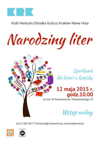Klub Herkules Ośrodka Kultury Kraków-Nowa Huta (ul. gen. M. Karaszewicza-Tokarzewskiego 29) zaprasza na cykliczne wydarzenie z cyklu Spotkanie z książką, którego głównym celem jest rozbudzanie kultury czytelniczej wśród dzieci przez przybliżanie im różnych gatunków literackich. Podczas majowego spotkania, które odbędzie się 12 maja o godz. 10.00 nie zabraknie warsztatów plastycznych oraz zabaw integracyjnych. Impreza przygotowana przy współpracy z Nowohucką Biblioteką Publiczną.
