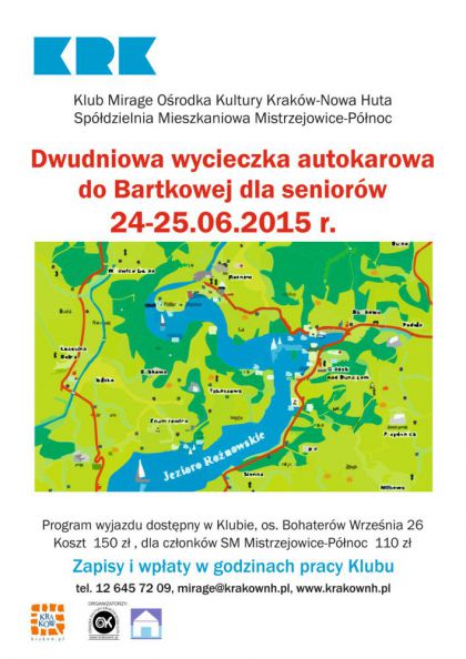 Klub Mirage Ośrodka Kultury Kraków-Nowa Huta (os. Bohaterów Września 26) zaprasza w dniach 24-25 czerwca na 2-dniowy relaks i rekreacja nad Jeziorem Czorsztyńskim zakończony wieczornym muzycznym piknikiem z zespołem Dalmacja Band. Zakwaterowanie w Domu Wypoczynkowym Stalownik. Zapisy i wpłaty do 28 maja br. Szczegółowe informacje w Klubie. Ilość miejsc ograniczona.