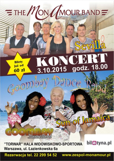 Zapraszamy do Warszawy, 3.10.2015. na godz. 18.00. Gościem naszej gwiazdy, zespołu Mon Amour będzie grupa Goombay Dance Band. Podczas tego koncertu, obok znanych i lubianych utworów Mon Amour usłyszymy legendarne hity Goombay Dance Band, takie jak: Sun of Jamaica, Seven Tears czy też Eldorado.