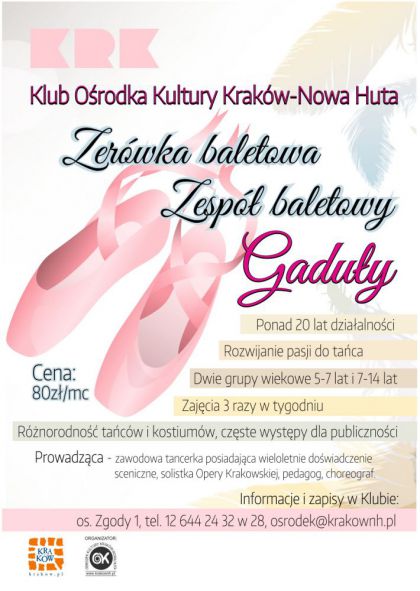 Od września Klub Ośrodka Kultury Kraków-Nowa Huta prowadzi nabór do zerówki baletowej i zespołu baletowego Gaduły. Zapraszamy dzieci, które kochają taniec i chcą przeżyć wspaniałą przygodę zarówno na sali baletowej jak i podczas występów. Do zerówki baletowej zapraszamy dzieci w wieku 5-7 lat a do zespołu baletowego w wieku 7-14 lat.