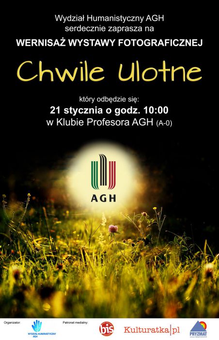 Studenci II roku kulturoznawstwa WH AGH zapraszają wszystkich na wystawę fotograficzną "Chwile ulotne". Zaczynamy 21.01. o godz. 10:00 w Klubie Profesora (budynek A-O). Przyjdźcie zobaczyć co przygotowaliśmy!