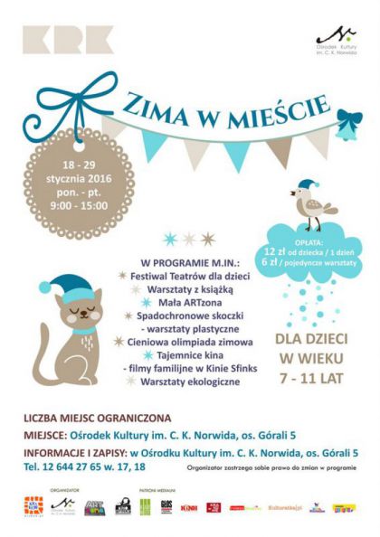 Ośrodek Kultury im C. K. Norwida serdecznie zaprasza na Zimowe warsztaty, czyli kolejną odsłonę cyklu zajęć dla dzieci w czasie małopolskich ferii zimowych 2016.