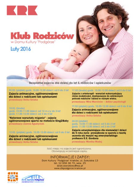 Od lutego zostaje uruchomiony w naszej placówce Klub Rodziców - bezpłatne zajęcia dla dzieci do lat 3, rodziców i opiekunów. W ofercie m.in Akademia Młodej Mamy, zajęcia umuzykalniające, kurs pierwszej pomocy przedmedycznej, warsztaty dla kobiet w ciąży i ich partnerów oraz zajęcia animacyjne, ruchowe, arteterapii i inne.