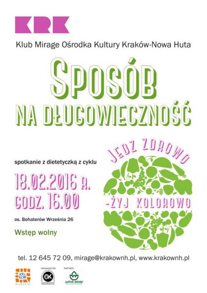 "Jedz zdrowo – żyj kolorowo" to nowy cykl spotkań dla seniorów promujący zdrowy styl życia w Klubie Mirage Ośrodka Kultury Kraków-Nowa Huta (os. Bohaterów Września 26). Pierwsze spotkanie odbędzie się 18 lutego o godz. 16.00. Odżywianie seniora to nie tylko liczenie kalorii. Zbilansowana dieta i aktywność fizyczna przyczyniają się do lepszej jakości życia i braku chorób. Uczestnicy spotkań dowiedzą się jakie składniki w diecie będą przeciwdziałać problemom ze zdrowiem a których należy się wystrzegać oraz jak ograniczyć ryzyko niedoboru witamin. Dietetycy pokażą jak komponować posiłki aby wspomagały sprawność fizyczną, psychiczną oraz spowalniały procesy starzenia. Spotkania poprowadzą eksperci z Centrum Dietetycznego Naturehouse.