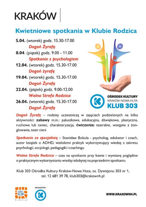 Do czego wykorzystać nakrętki z butelek PET? Czy luneta może być papierowa? Jakie mogą być jeszcze zabawki? Na te pytania będzie można znaleźć odpowiedź 5 kwietnia o godz. 15:30 podczas kolejnego spotkania w Klubie Rodzica goniąc żyrafę w Klubie 303 Ośrodka Kultury Kraków-Nowa Huta (os. Dywizjonu 303 nr 1). Na początku zajęć oczywiście nie zabraknie paluszkowych zabaw, czy tak lubianych nie tylko przez dzieci, masażyków. Na rozgrzewkę potańczymy i pośpiewamy, żeby w końcu przejść do dzieła, czyli wykonać proste zabawki z recyklingu.