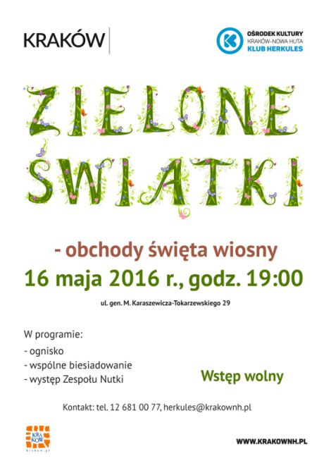 Klub Herkules Ośrodka Kultury Kraków-Nowa Huta (ul. gen. M. Karaszewicza-Tokarzewskiego 29) serdecznie zaprasza na tradycyjne obchody święta wiosny, czyli tzw. Zielone Świątki, które odbędą się 16 maja o godz. 19:00. Impreza poświęcona będzie przybliżeniu zwyczajów związanych z Sobótkami. Uczestników zachęcamy do wspólnego dekorowania domów oraz Klubu zielonymi gałązkami, po którym nastąpi ognisko. Wydarzeniu towarzyszyć będzie wspólne biesiadowanie i zabawy. Podczas imprezy wystąpi zespół Nutki z programem artystycznym. Spotkanie organizowane jest wspólnie z Klubem Seniora.