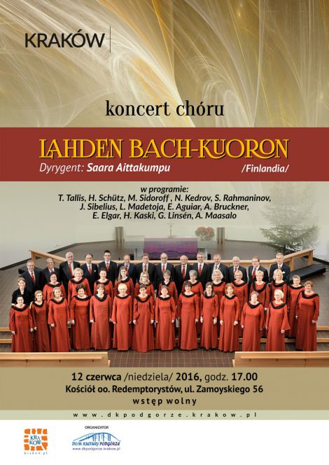 Fiński chór mieszany, imienia ,,Bacha” z miasta Lahti w Finlandii, składający się z 50 osób. Został założony w 1982 roku, od tego czasu z powodzeniem koncertuje po całej Finlandii jak i Europie.Dyrygentką chóru jest Saara Aittakumpu, która ukończyła w 2007 r. z wyróżnieniem Akademię Muzyczną im. Sibeliusa w Helsinkach. Oprócz chóru z Lahti jest również dyrygentką jak i artystycznym dyrektorem męskiego chóru The Polytech Choir. W swojej karierze artystycznej przygotowywała chóry do dużych projektów operowych i oratoryjnych. Na swoim koncie ma liczne nagrody między innymi w 2015 roku w ramach 5-go Międzynarodowego Konkursu dla dyrygentów im. Antona Brucknera w Austrii otrzymała specjalną nagrodę Conductor Prize . Program koncertu:Thomas Tallis: If ye love me, Heinrich Schütz Aller Augen warten auf dich Herre, Kaikki katsovat sinua, Herra, Mikko Sidoroff Panihidan troparit, Kanonin kolmas veisu Kanonin kuudes veisu, Panihidan kontakki, Nikolai N. Kedrov Katso, kiittäkää Herraa, Sergei Rahmaninov Bogoroditse Devo, Jean Sibelius Soi kiitokseksi Luojan, Leevi Madetoja Ei mitään multa puutu, Ernani Aguiar Salmo 150, Anton Bruckner Locus iste, Edward Elgar As Torrents in Summer, Heino Kaski Kesäyö, Gabriel Linsén Kesäpäivä Kangasalla, Armas Maasalo Tuhansin kielin
