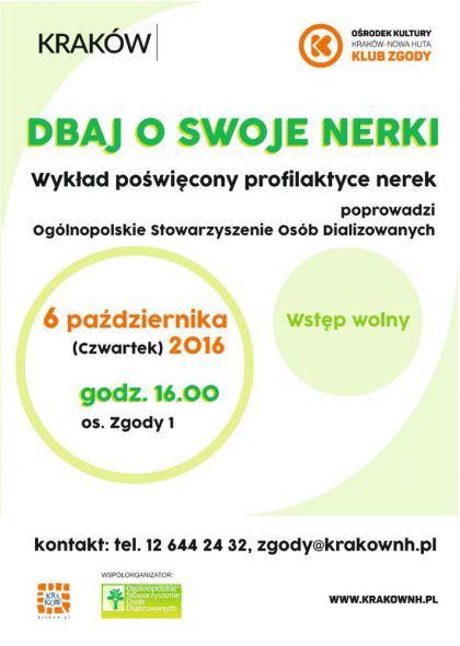 Klub Zgody Ośrodka Kultury Kraków-Nowa Huta (os. Zgody 1) zaprasza 6 października na godz. 16.00 na spotkanie pt. „Dbaj o swoje nerki”. Spotkanie polegać będzie na pracy zespołowej, które poprowadzi Ogólnopolskie Stowarzyszenie Osób Dializowanych, które podczas spotkania przybliży problem rozwoju Przewlekłej Choroby Nerek oraz opowie jak utrzymać nerki w dobrej kondycji i zmniejszyć ryzyko zachorowania. Stowarzyszenie od 2004 r. zrzesza osoby dializowane, po przeszczepie oraz ich rodziny z całej Polski. W ramach prowadzonej działalności edukuje i wspiera pacjentów z Przewlekłą Chorobą Nerek, promuje profilaktykę chorób nerek oraz ideę transplantacji, jako najlepszą metodę ratowania życia ciężko chorych osób.