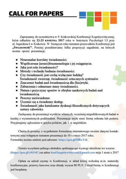 Krakowska Konferencja Kognitywistyczna to wydarzenie organizowane przez członków Koła Naukowego Studentów Kognitywistyki UJ mające na celu promocję tej interdyscyplinarnej dziedziny. W roku 2017 tematem przewodnim 9 edycji konferencji będzie świadomość.