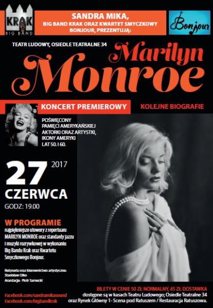 Sandra Mika, Big Band Krak oraz Kwartet Smyczkowy Bonjour zapraszają Państwa na premierowy koncert, pt: „Marilyn Monroe- Kolejne Biografie”.