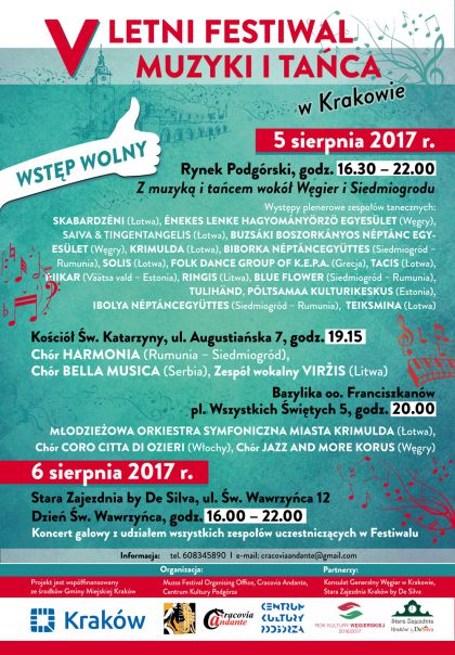 W dniach 5 i 6 sierpnia 2017 r. odbędzie się w Krakowie V Letni Festiwal Muzyki i Tańca, podczas którego gościć będziemy w naszym mieście zespoły taneczne i muzyczne z całej Europy. Festiwal