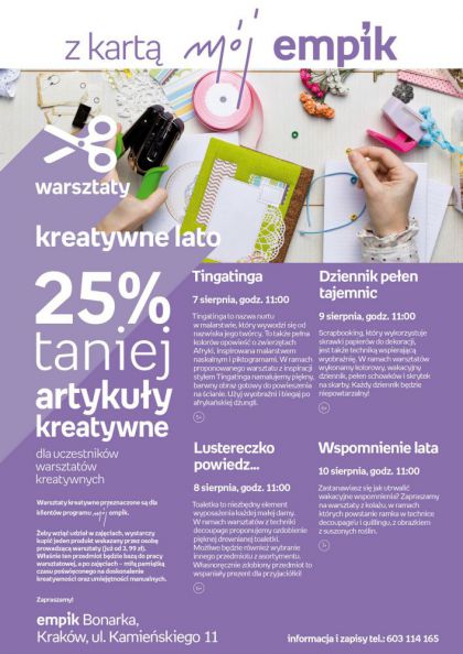 Warsztaty kreatywne przeznaczone dla klientów programu Mój Empik są bezpłatne. Aby wziąć udział w zajęciach, wystarczy kupić jeden produkt wskazany przez osobę prowadzącą warsztaty (koszt już od 3,99 zł). Właśnie ten przedmiot będzie bazą do pracy warsztatowej, a po zajęciach – miłą pamiątką czasu poświęconego na doskonalenie kreatywności i umiejętności manualnych.