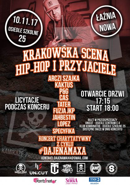 Gorąco zapraszamy na charytatywny hiphopowy koncert, który odbędzie się 10.11.2017r. w Teatrze Łaźnia Nowa. Miejsce i artyści nie są przypadkowi, bo jak wiadomo Max wychował się w Hucie. Szykujemy wiele niespodzianek. Podczas koncertu odbędą się również licytacje. Będziecie też mogli kupić koszulki #DAJENAMAXA. Cała zebrana kwota zostanie przeznaczona na leczenie Maxa (przeszczep komórek macierzystych).. Max ma szanse stanąć na nogi. Artyści grają charytatywnie, bo każdy z nich #DAJENAMAXA. Wiemy także, że każdy z Was też #DAJENAMAXA, więc nie będziemy biletować wstępu. Żeby bawić się z nami wystarczy wesprzeć Maxa kwotą nie mniejszą niż 25PLN wpłacając na konto 67 1140 2004 0000 3902 4269 8924 w tytule podając swoje imię i nazwisko/KONCERT, a my wpiszemy Was na listę. Jeśli zdecydujecie się przyjść dopiero w dniu koncertu, nie zapomnijcie włożyć przynajmniej 30 PLN do puszki, która będzie stała przy wejściu.