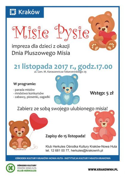 Klub Herkules Ośrodka Kultury Kraków-Nowa Huta (ul. gen. M. Karaszewicza-Tokarzewskiego 29) zaprasza dzieci na imprezę z okazji obchodów Światowego Dnia Pluszowego Misia we wtorek 21 listopada o godz. 17.30. Miś jest przyjacielem dzieci, czy zatem wypada zapomnieć o urodzinach przyjaciela? Miś to nie tylko pluszowa przytulanka, to „ktoś” bardzo bliski, czuły, cierpliwy i często niezastąpiony. W programie: parada misiów, konkurs plastyczny, czytanie bajek, misiowa kraina, czyli zabawy, piosenki, konkursy, zagadki. Zabierz ze sobą ulubionego pluszowego misia.