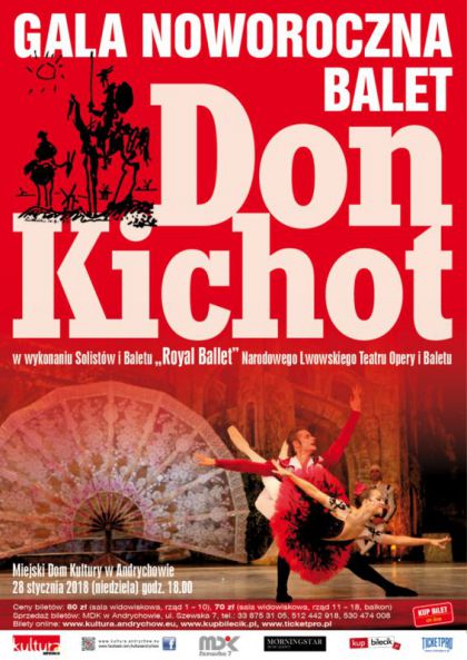 Don Kichot – to więcej niż balet. To barwne widowisko z udziałem baletu klasycznego, zachwycające bogactwem tańców i kostiumów oraz dowcipną narracją do muzyki Ludwiga Minkusa. Na andrychowskiej scenie wystąpią Soliści i Balet „Royal Ballet” Narodowego Lwowskiego Teatru Opery i Baletu – to gwarancja widowiska na najwyższym światowym poziomie artystycznym.
