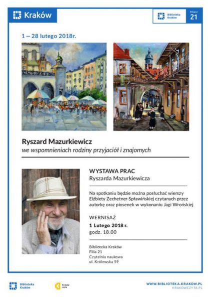 Wieczór wspomnień poświęcony Ryszardowi Mazurkiewiczowi połączony z wernisażem jego malarstwa. Na spotkaniu będzie można posłuchać wierszy Elżbiety Zechenter-Spławińskiej czytanych przez autorkę oraz piosenek w wykonaniu Jagi Wrońskiej.