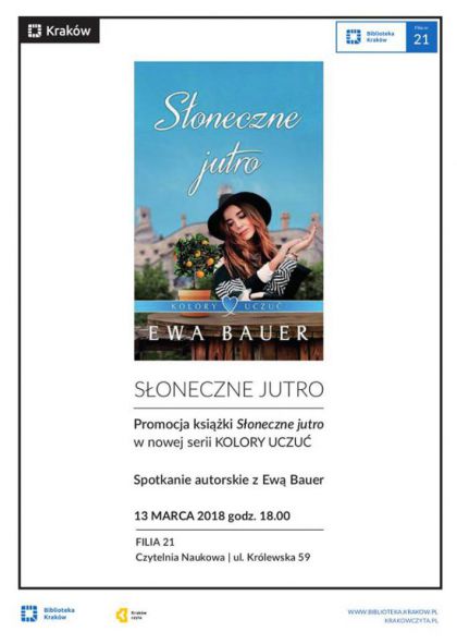 Zapraszamy na wieczór autorski Ewy Bauer i promocję jej najnowszej książki „Słoneczne jutro” z serii „Kolory uczuć”.