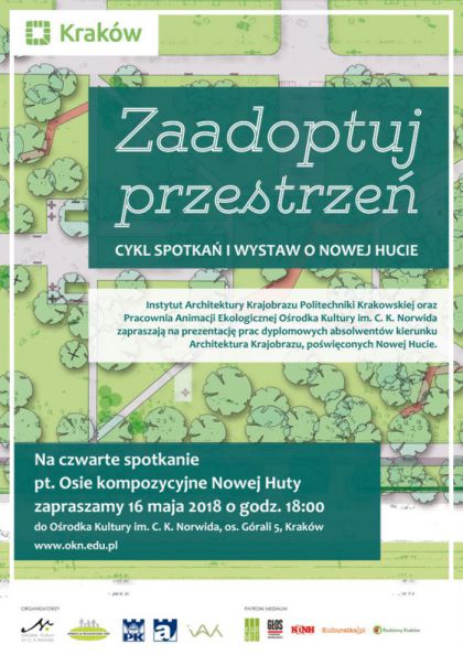 "ZAADOPTUJ PRZESTRZEŃ" to cykl tematycznych spotkań i wystaw, prezentujących prace dyplomowe studentów i absolwentów kierunku Architektura Krajobrazu Wydziału Architektury Politechniki Krakowskiej, poświęconych różnym przestrzeniom publicznym Nowej Huty.