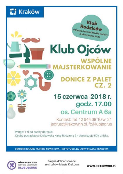 Klub Jędruś Ośrodka Kultury Kraków-Nowa Huta (os. Centrum A 6a) zaprasza 15 czerwca o godz. 17.00 do wspólnego majsterkowania. Podczas warsztatów majsterkowania ojcowie wraz z dziećmi wspólnie zbudują donice z palet oraz założą w nich ogródek ziołowy. Zajęcia, organizowane w ramach Klubu Rodziców, poprowadzi Michał Urbański - majsterkowicz amator, tata Helenki i Tadzia.