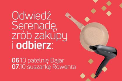 Już w najbliższy weekend (6 i 7 października) klienci Serenady będą mogli wziąć udział w specjalnej akcji promocyjnej. Za zakupy o równowartości 500 zł i okazaniu paragonów, odbiorą wyjątkowe prezenty! W sobotę będą na nich czekały wytrzymałe i praktyczne patelnie Dajar, a w niedzielę będzie można odebrać suszarkę firmy Rowenta.