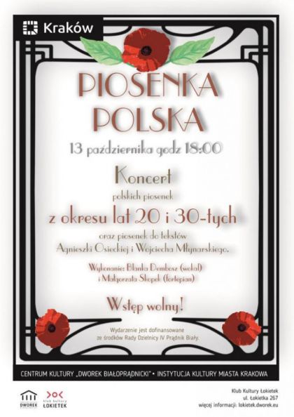 Klub Kultury Łokietek zaprasza na pierwszy koncert na swojej scenie muzycznej. W programie polskie utwory z lat 20 i 30-tych oraz piosenki do tekstów Agnieszki Osieckiej i Wojciecha Młynarskiego.