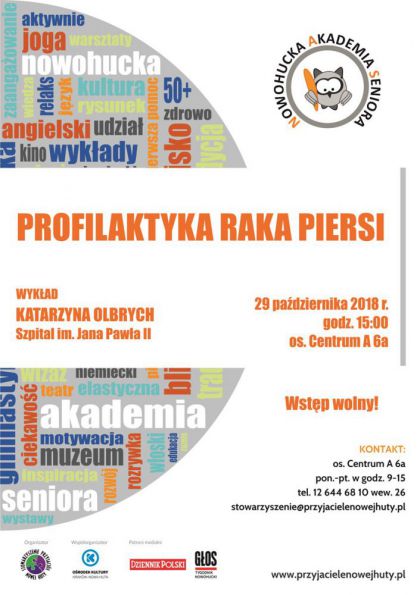 Nowohucka Akademia Seniora (os. Centrum A 6a) zaprasza 29 października o godz. 15.00 na wykład poświęcony profilaktyce raka piersi. Gościć będziemy realizatorów projektu pn. Zrób mammografię dla siebie i swoich bliskich! z Krakowskiego Szpitala Specjalistycznego im. Jana Pawła II. Projekt skoncentrowany jest na eliminowaniu najistotniejszych barier w dostępie do badań diagnostycznych oraz na zwiększeniu świadomości zdrowotnej mieszkańców Małopolski poprzez szeroko zakrojone działania edukacyjne. Podczas spotkania informacyjno-edukacyjnego zaprezentowane zostaną wykład i film Profilaktyka raka piersi. Organizatorzy zaplanowali także dyskusję, konkurs wiedzy z nagrodami oraz drobny poczęstunek.