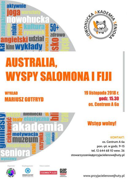 Nowohucka Akademia Seniora (os. Centrum A 6a) zaprasza 19 listopada o godz. 15.30 na spotkanie z geografem i podróżnikiem - Mariuszem Gotfrydem, który opowie i zaprezentuje kadry ze swojej podróży po Australii, Wyspach Salomona i Fiji.