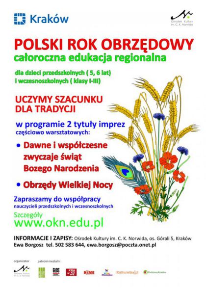 Podczas imprez opowiemy i porozmawiamy z dziećmi o cudownych obrzędach, tradycjach i zwyczajach okresu Bożego Narodzenia w tym o „chodzeniu po kolędzie”, kolędowaniu i kolędnikach. Wspólnie zaśpiewamy kolędy. Ubierzemy dawną i współczesną choinkę. We wspaniałych, tradycyjnych strojach wystąpi najlepsza w Małopolsce grupa kolędnicza „HERODY” z Zielonek, wielokrotni zdobywcy „Złotych spinek” podczas Festiwalu w Bukowinie Tatrzańskiej. Dzieci wezmą udział w „okolędowaniu”. Złożymy tradycyjne życzenia noworoczne, sypiąc owsem „na obfitość”. Na koniec spotkań grupy będą mogły zrobić sobie zdjęcie z Herodami ( proszę przynieść własne aparaty lub komórki). To już ostatnie spotkania w Ośrodku Kultury Norwida z cyklu „Polski Rok Obrzędowy” dlatego tym bardziej zachęcamy do udziału przeszkola i szkoły!