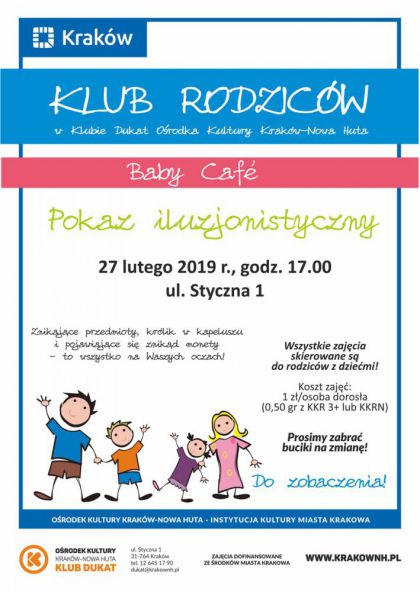 Znikające w tajemniczy sposób przedmioty, królik wyskakujący z kapelusza, magicznie pojawiające się monety – uczestnicy spotkania z iluzjonistami w Klubie Dukat (ul. Styczna 1) muszą przygotować się na liczne niespodzianki i zaskakujące zwroty akcji. Co więcej - w każdej chwili sami mogą stać się bohaterami pokazu, ponieważ goście kolejnego spotkania z cyklu Baby Cafe zaproszą widzów do wspólnej zabawy. Klub Dukat zaprasza 27 lutego w godz. 17.00-18.00.