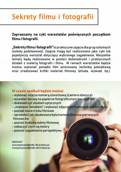„Sekrety filmu i fotografii” to praktyczne zajęcia dla grup szkolnych (szkoły podstawowe). Zajęcia mogą być realizowane jako cykl lub pojedynczy warsztat dotyczący wybranego zagadnienia. Wszystkie tematy będą realizowane w postaci doświadczeń i praktycznych działań z materią fotografii i filmu.