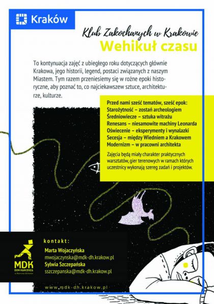 To kontynuacja zajęć z ubiegłego roku dotyczących głównie Krakowa, jego historii, legend, postaci związanych z naszym Miastem. Tym razem przeniesiemy się w rożne epoki historyczne, aby poznać to, co najciekawsze w sztuce, architekturze, kulturze.