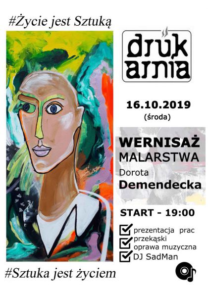Z ogromną przyjemnością informuję Państwa o wernisażu malarstwa krakowskiej artystki Doroty Demendeckiej,który odbędzie się 16 października o godzinie 19tej w Klubie Drukarnia na ulicy, Nadwiślańskiej 1.