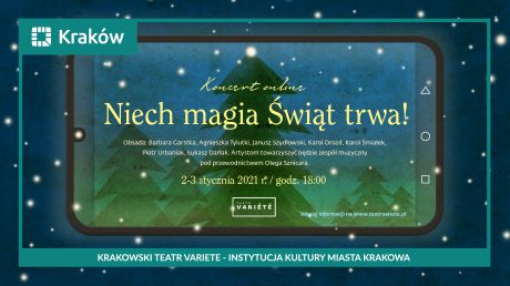 „Niech magia Świąt trwa” to niezwykły koncert online, podczas którego zabrzmią wyjątkowe polskie kolędy, pastorałki oraz bożonarodzeniowe piosenki. Na żywo z Krakowskiego Teatru Variete połączą się oraz zadbają o świąteczny nastrój: Barbara Garstka, Agnieszka Tylutki, Karol Drozd, Karol Śmiałek, Piotr Urbaniak, Łukasz Darłak i Dyrektor Krakowskiego Teatru Variete, Janusz Szydłowski. Artystom towarzyszyć będzie zespół muzyczny pod przewodnictwem Olega Sznicara.