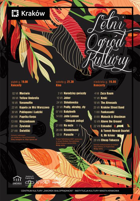 W razie niepogody wydarzenia zostaną przeniesione do Sali Kominkowej - Budynek Główny (koncerty) i Sali Teatralnej – Oficyna Wschodnia (kino), a ilość miejsc będzie ograniczona.