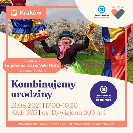 W sobotę 21 sierpnia w godz. 17.00-19.30, z okazji 30-lecia Ośrodka Kultury Kraków Nowa Huta, Klub 303 (os. Dywizjonu 303 nr 1) organizuje urodzinowe spotkanie. Zaproszeni goście - czyli Wy wszyscy - będziecie mieć okazję wziąć czynny udział w przygotowaniach do imprezy. Wspólnie udekorujemy gigantyczny tort, przygotujemy urodzinowe dekoracje i elementy strojów. Nie zabraknie też niespodzianek przygotowanych przez gospodarzy imprezy. Będzie można zakręcić kołem fortuny i wygrać urodzinową usługę, pograć w gigantyczną grę, a także posłuchać muzyki. Finałem imprezy będzie pokaz niespodzianka i „Tortowa Parada”. Impreza adresowana jest do wszystkich mieszkańców okolicznych osiedli oraz rowerzystów, pokonujących nowohucki szlak Velo Huta.